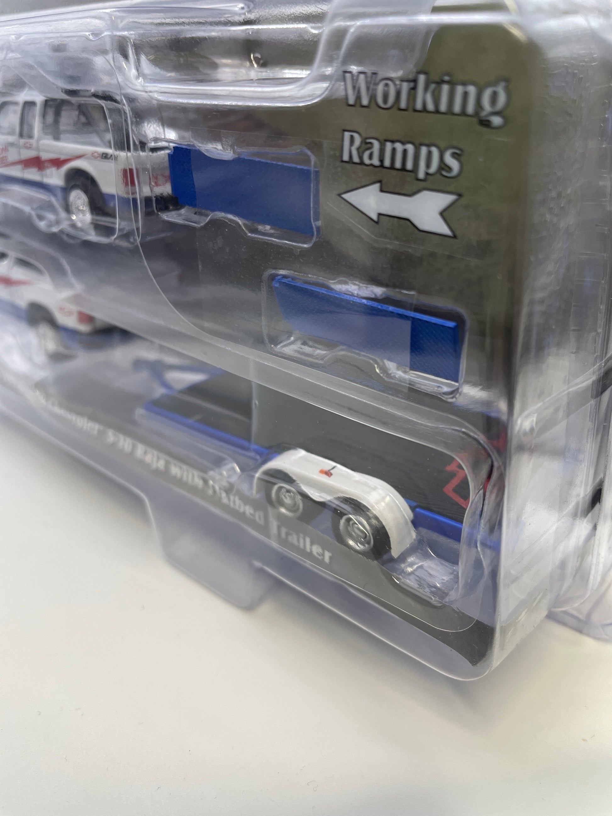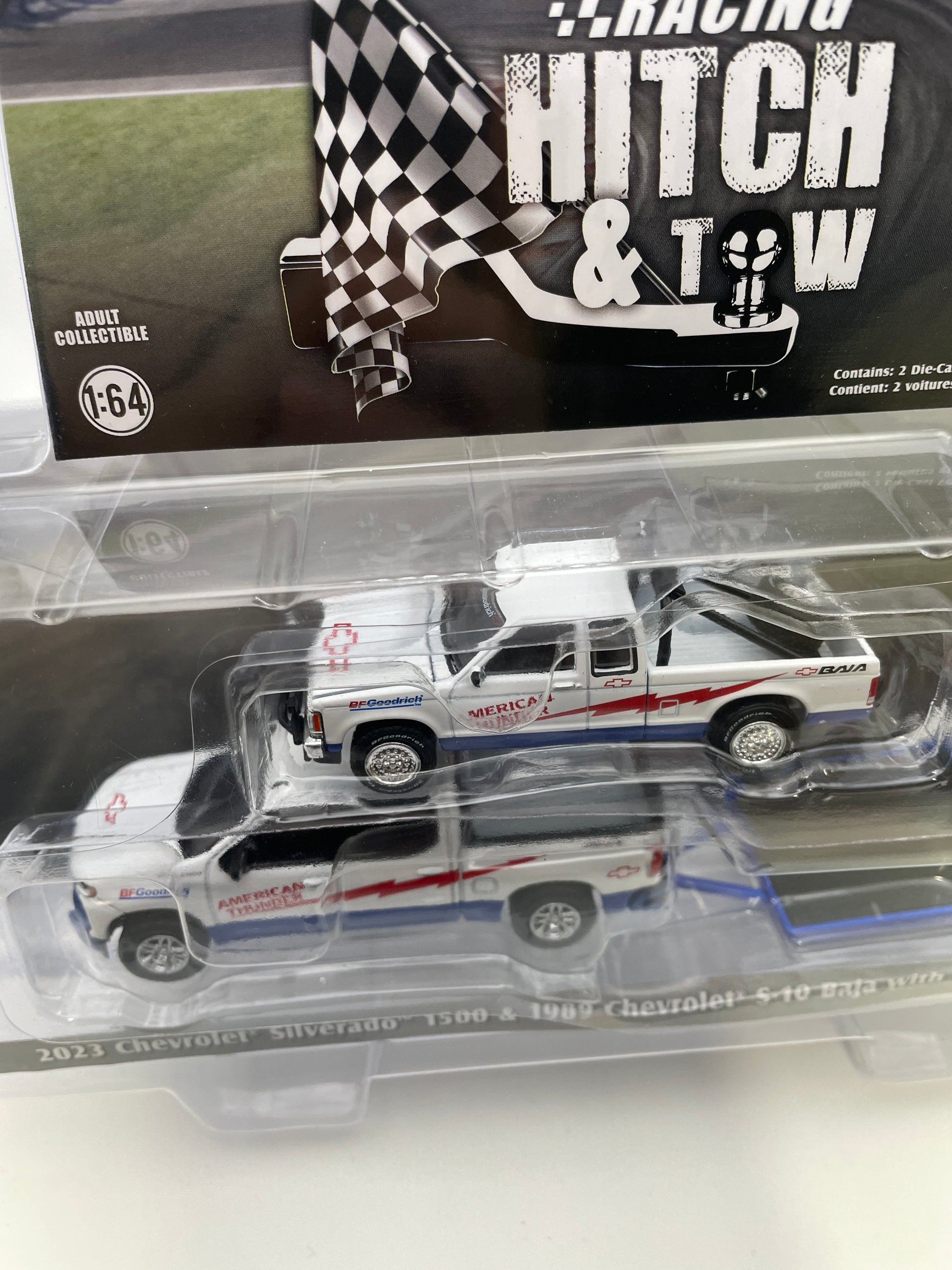 Greenlight 1/64 Racing Hitch & Tow 2023 Chevrolet Silverado 1500 & 1989 Chevrolet S-10 Baja w/ Flatbed Trailer White & Blue