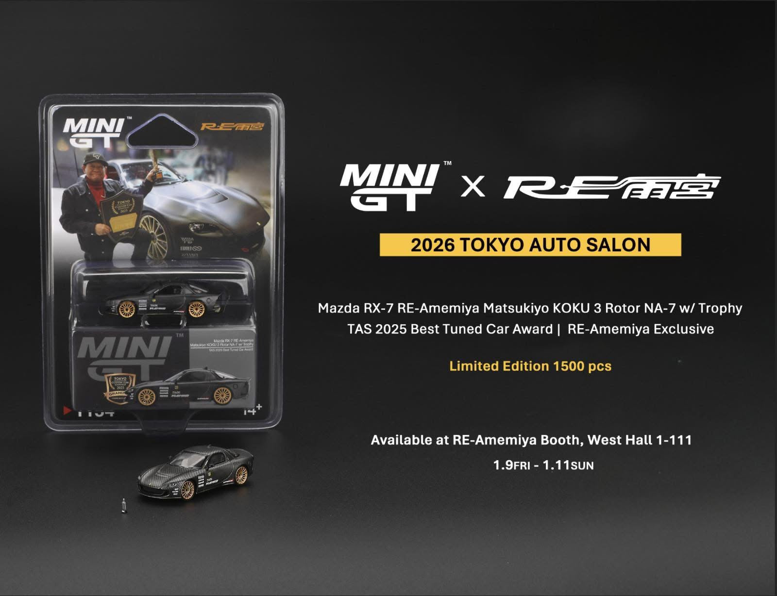 Mini GT 1/64 Tokyo Auto Salon 2026 Mazda Rx-7 RE-Amemiya Matsukiyo Koku 3 Rotor NA-7 w/ Trophy TAS 2025 Best Tuned Car Award Black - MGT01154-BL